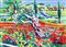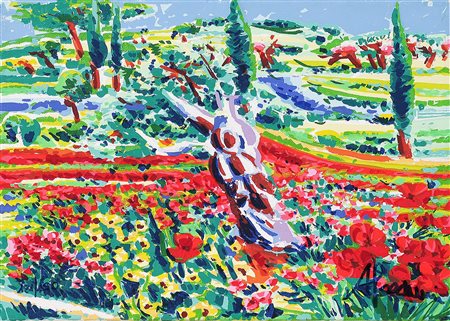 FACCINCANI ATHOS (n. 1951) Luce, sole alto e colori intorno ad un olivo. Serigrafia su tela. Cm 25,00 x 35,00 x 2,00. Tir. 121/150 e firma in basso a destra. Al retro descrizione dell'opera.