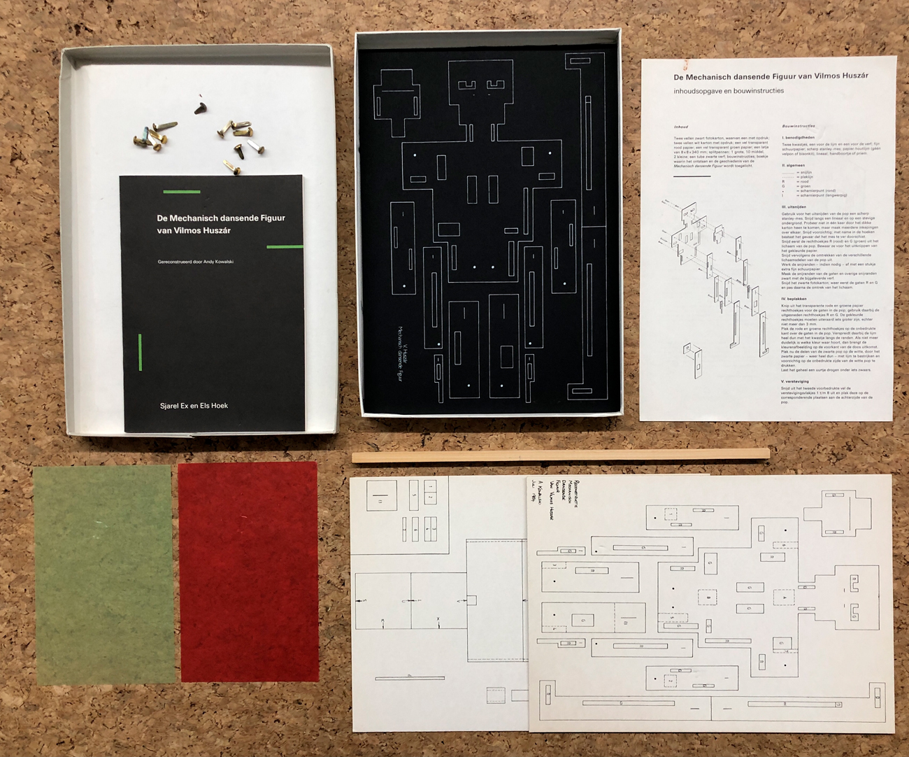 Cofanetto rigido completo contenente, 2 cartoncini neri, 2 cartoni bianchi, 2 foglio di carta velina, un tubetto di vernice, un pezzo di legno, 12 coppiglie ed un piccolo catalogo per la realizzazione della figura meccanica danzante di Viloms Huszár degli anni '20