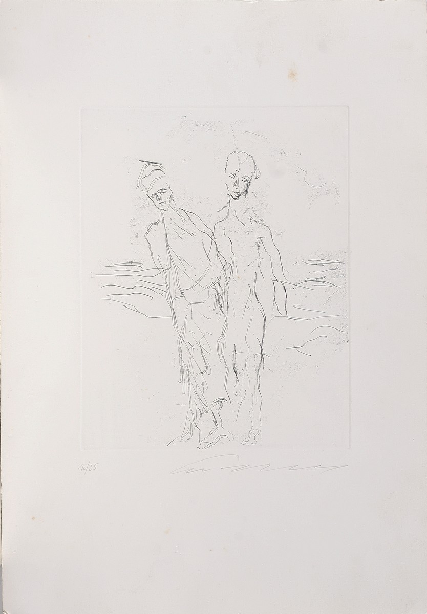 TRECCANI ERNESTO (1920 - 2009) Senza titolo (n.3 opere). Litografia. . Lotto composto da due litografie: Fiori, cm 35x55, 34/50; Volto, cm 51x40 P.A.; e un'acquafortem, Coppia di personaggi, cm 50x35, 10/25. Fioriture su tutte e tre le opere.