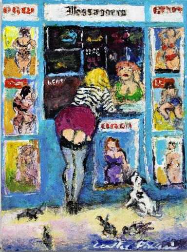 PIACESI WALTER Peschiera del Garda 1951 “L’edicola” olio su tavola cm 24x18 del 2012. Firmato sul fronte in basso a destra. Sul retro data, firma, titolo, tecnica e misure. Autentica dell'artista su foto.