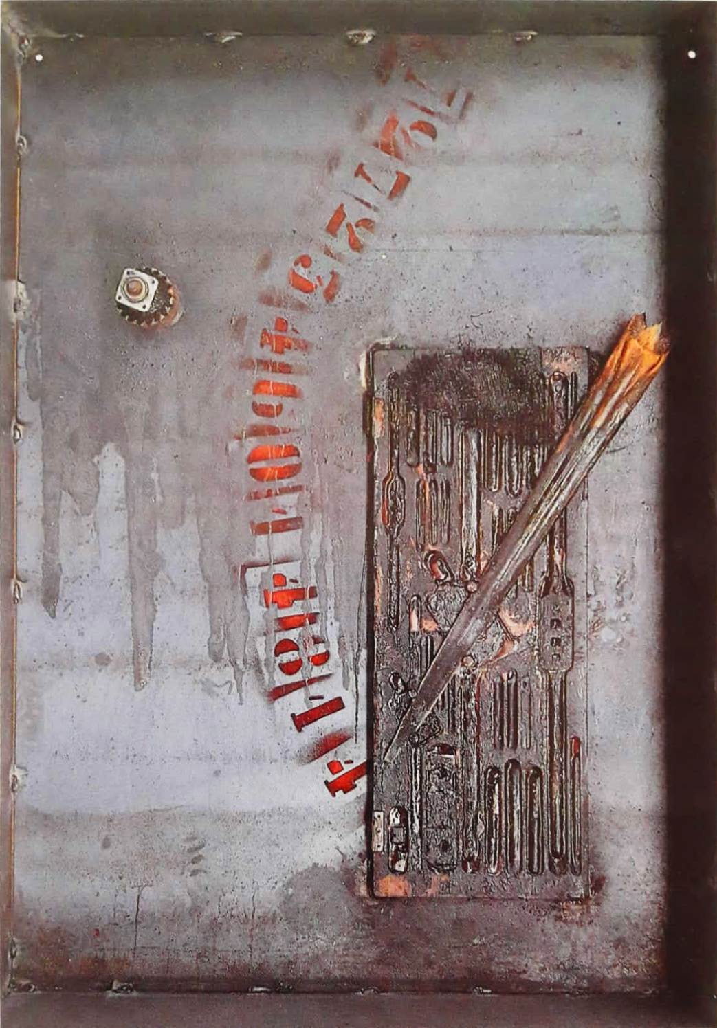 DE CHIRICO JAKOB Innsbruck 1943 “Senza titolo” acrilici e assemblaggio di oggetti di recupero in teca di acciaio cm 80x110x33 di spessore. Opera pubblicata a piena pagina del catalogo “Makela”