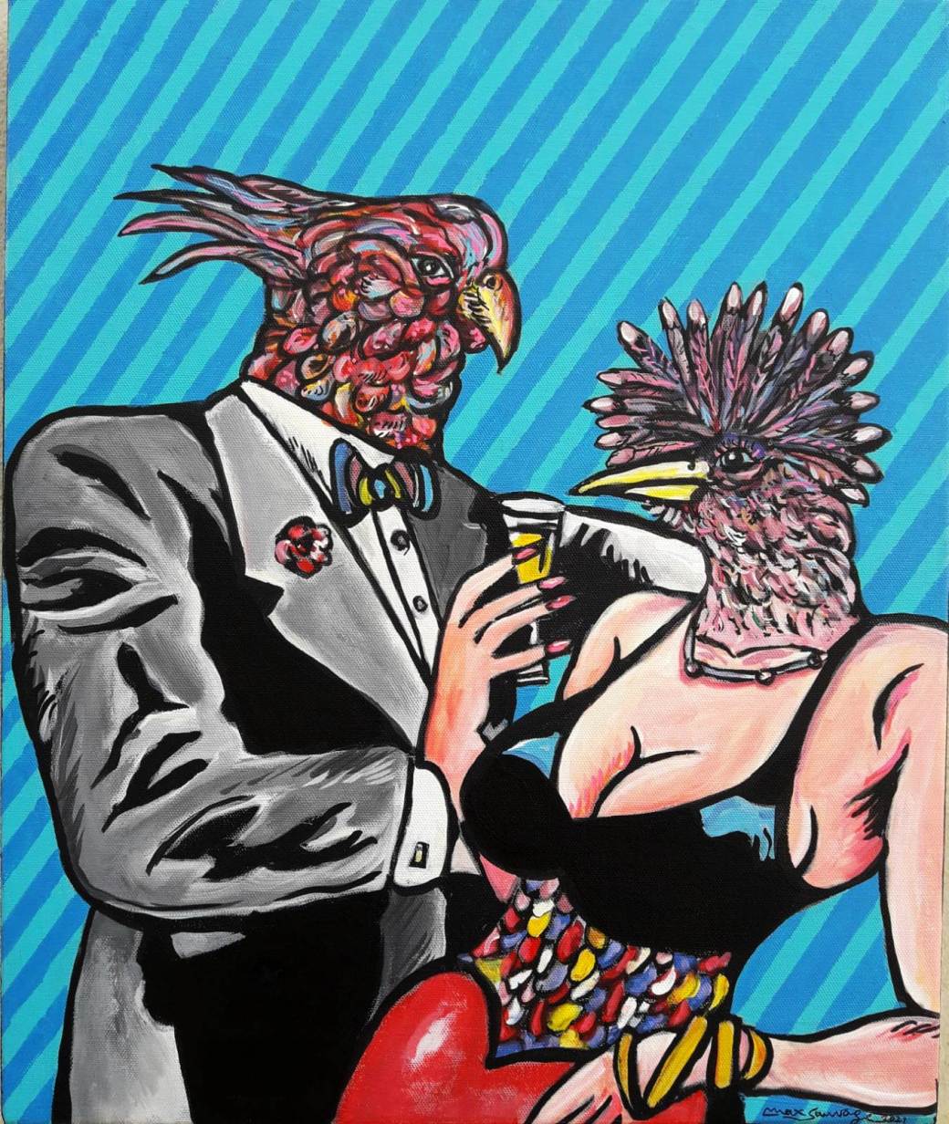 MAX HAMLET SAUVAGE Lecce 1950 "Gli amanti” acrilico su tela cm 40x48 del 2021. Firmato e datato sul fronte in basso a destra. Sul retro titolo, firma ed etichetta descrittiva. Autentica e archiviazione su foto a cura dell’artista.