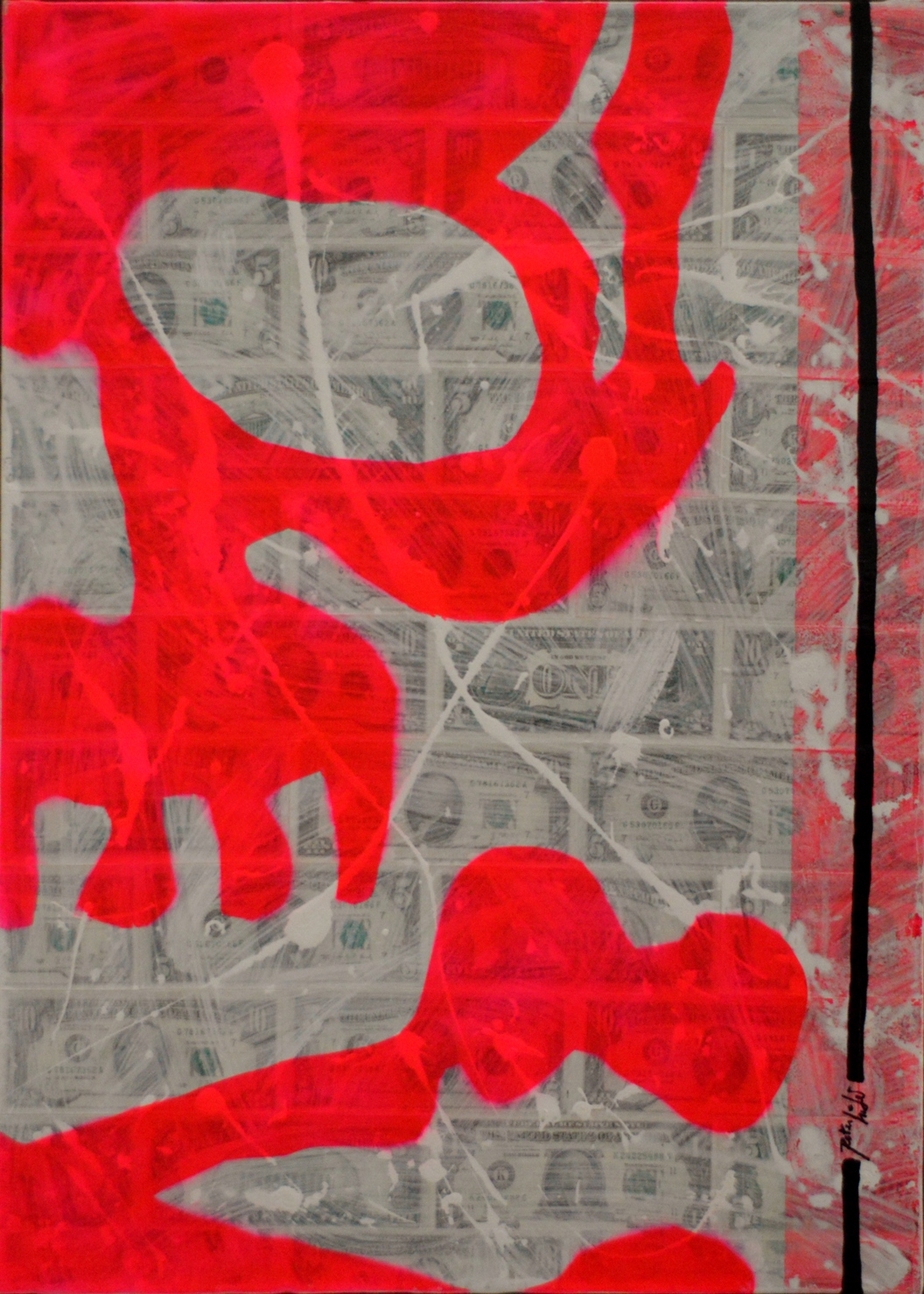 HIDE PITER Varese 1955 “Skull” della serie “Skull and flowers series” tecnica mista e banconote su tela in teca di plexiglass cm 50x70x4 del 2014. Sul retro firmato, datato ed titolato. Autentica su foto e foto dell’artista con l’opera.