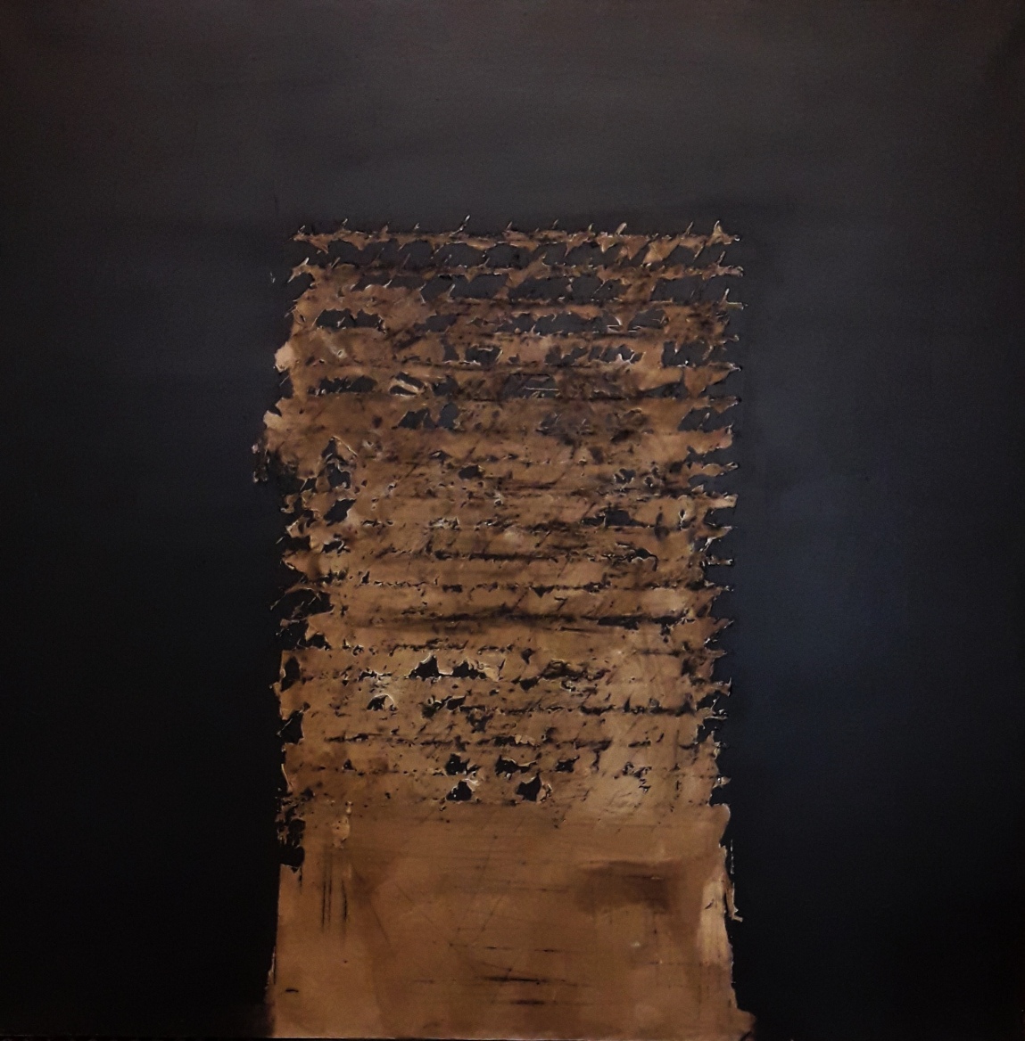 RAPETTI ALFREDO Milano 1961 “Scrittura sacra” olio e tecnica mista su tela cm 100x100 del 2012. Sul retro firmato, intitolato e datato. Autentica su foto a cura dell’artista.