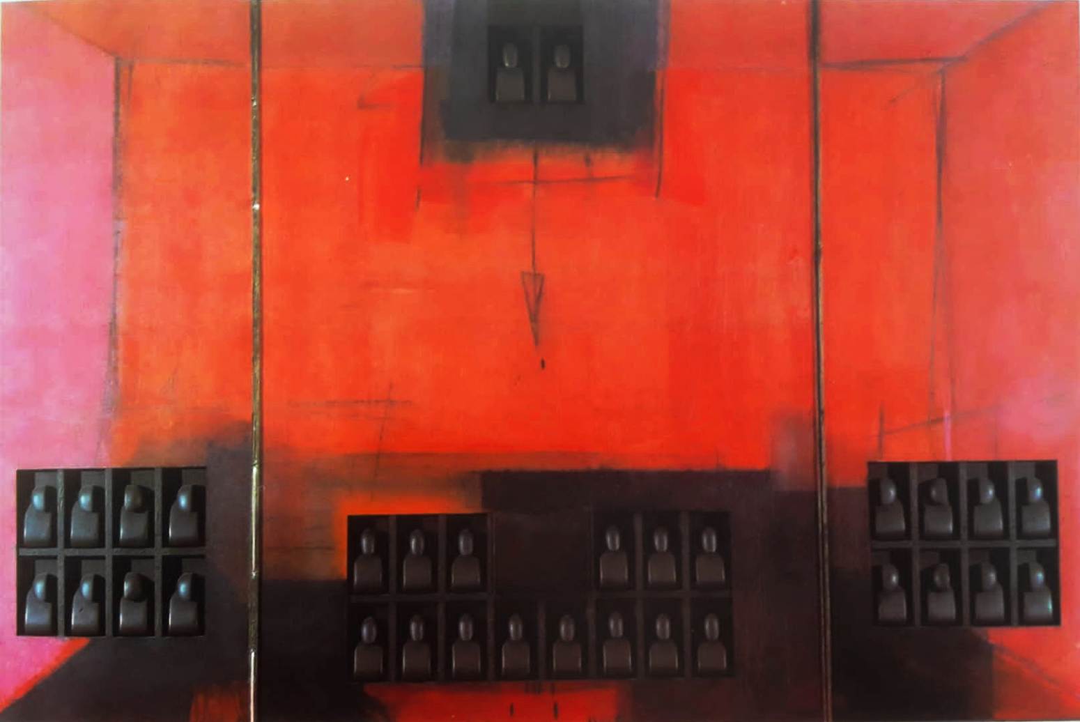 CECCONELLO GASTONE Vercelli 1942 “Composizione in rosso” polimaterico su tavola (trittico)cm 260x160x8 del 1984. Opera pubblicata a piena pagina del catalogo”Gastone Cecconello”, opere dal 1975-1986.