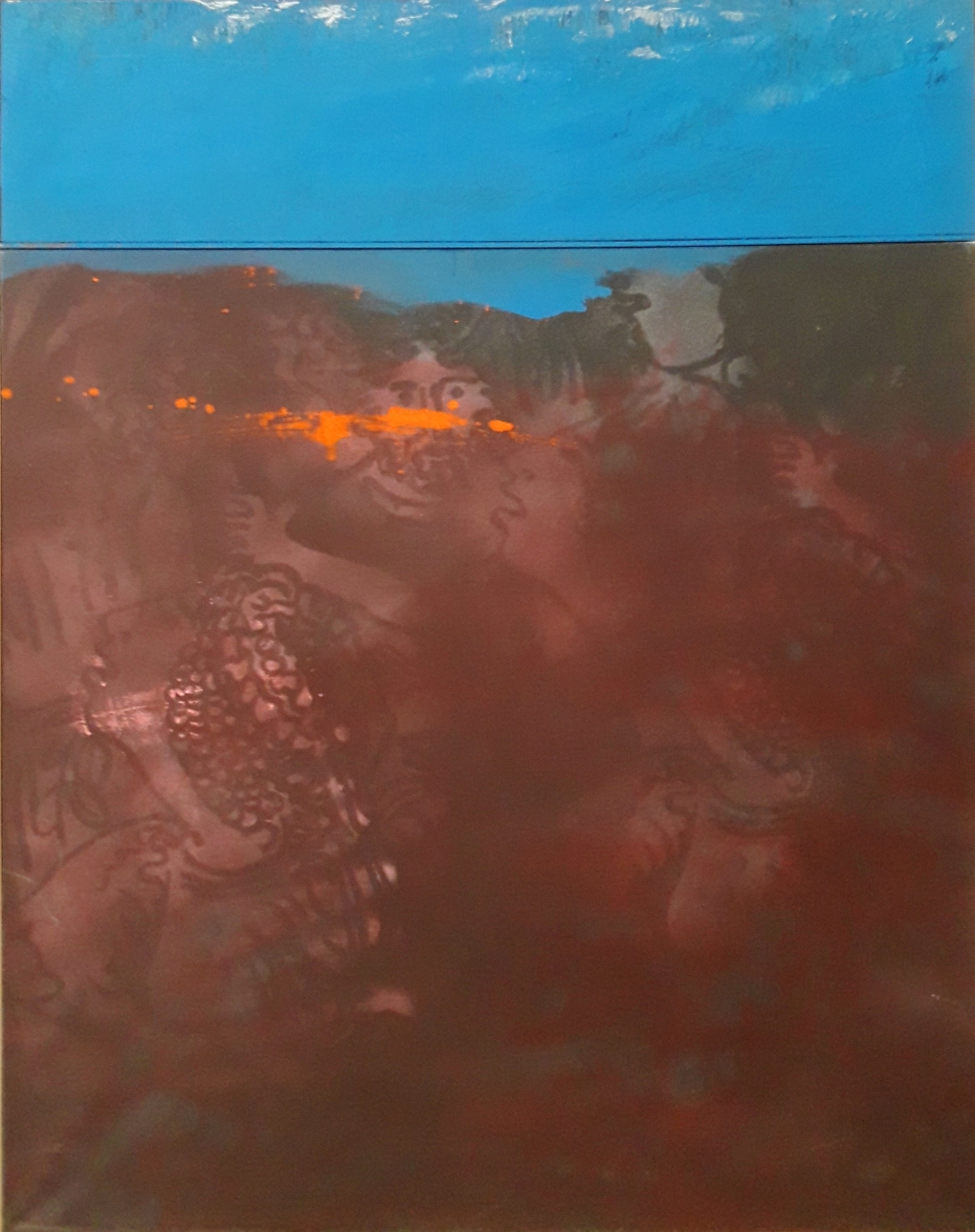 BARATELLA PAOLO Bologna 1935 "Sul monte Citerone, Baccanti e Dionisio” tecnica mista su tela cm 100x125,5 del 2001.L’opera è composta da due tele una di cm 100x25, l’altra di cm 100x100. Sul retro firmata, intitolata e datata. Autentica su foto a cura dell’artista.