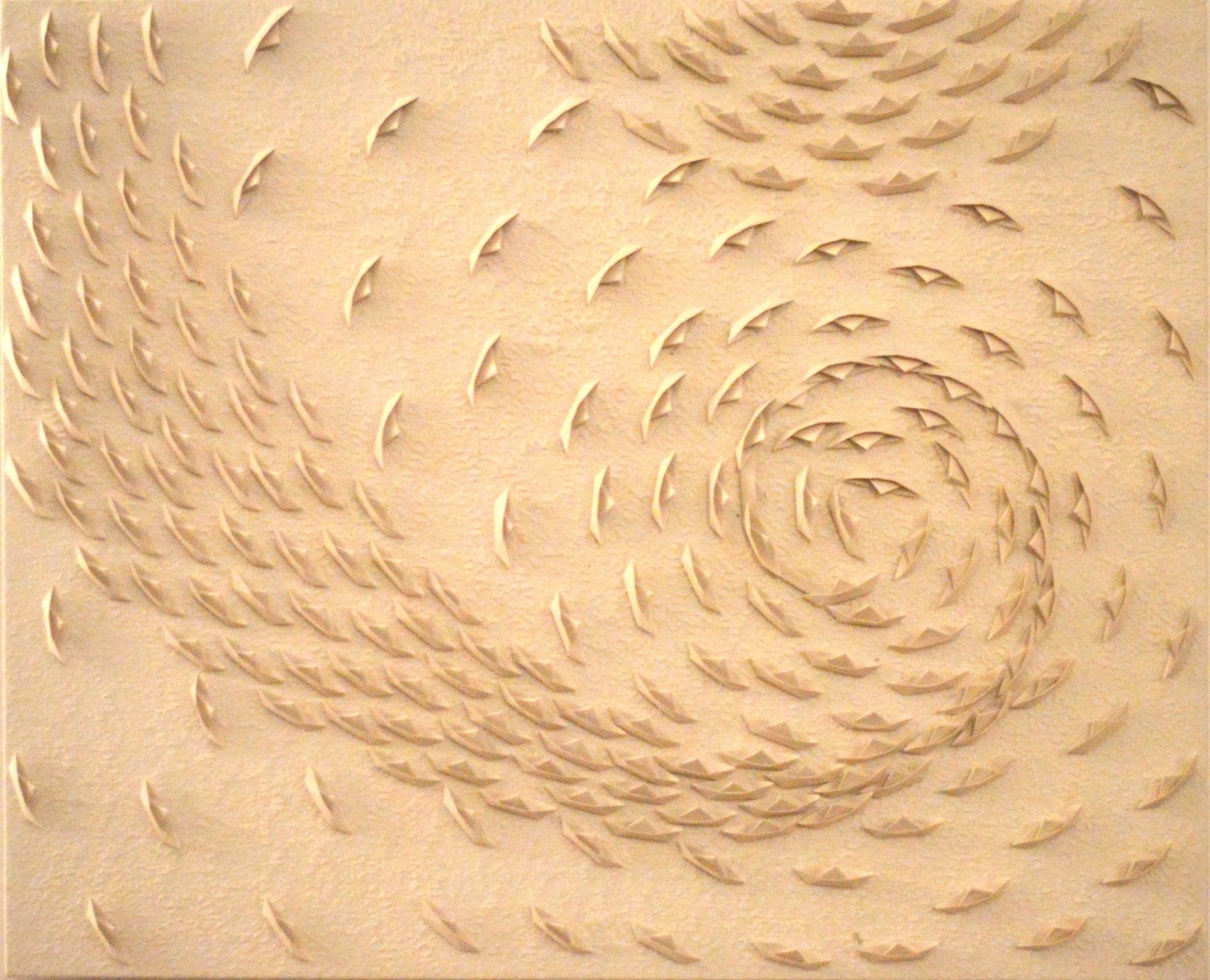 GUSMAROLI RICCARDO Verona 1963 “Senza Titolo” barche di carta su tela e carta del 15/11/2014 archiviato al N°032 2014, cm 55x45x4, splendidamente incorniciato in teca di plexiglass, l'opera è pubblicata. Autentica su foto a cura dell' artista.