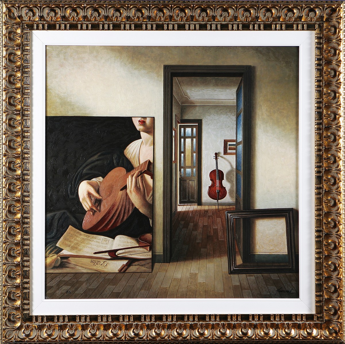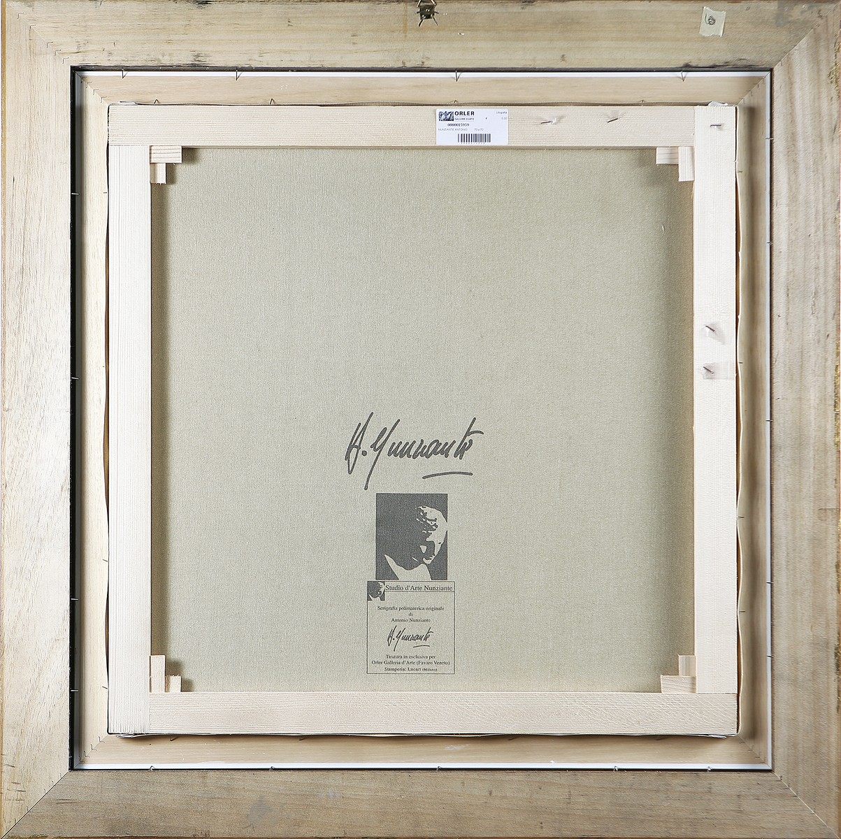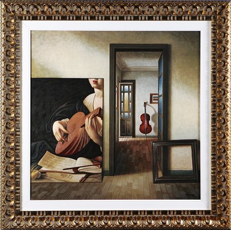 NUNZIANTE ANTONIO (n. 1956) Le stanze della musica. 2010. Serigrafia su tela. Cm 70,00 x 70,00. P.A. in basso a destra, firma in basso a sinistra. Al retro garanzia di autenticità della Galleria d'arte Nunziante. Opera archiviata presso Metamediale srl, Giaveno (TO), come da documentazione fotografica allegata riportante il relativo numero d'archivio. In allegato all'opera catalogo Nunziante, In nome della bellezza, a cura della Galleria d'arte Orler, nel quale è pubblicata l'opera. . Cornice presente
