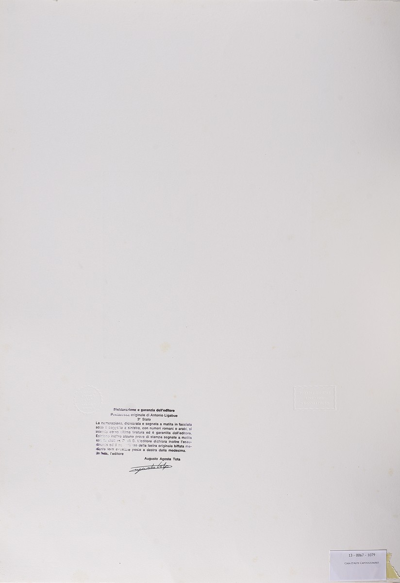 LIGABUE ANTONIO (1899 - 1965) San Bernardo. Puntasecca su zinco. Cm 50,00 x 70,00. Tir. 91/149 in basso a matita. Misure lastra: 22x25 cm. Timbro a secco Antonio Ligabue e timbro a secco Augusto Agosta Tota editore Parma. Al retro dichiarazione e garanzia dell'editore.