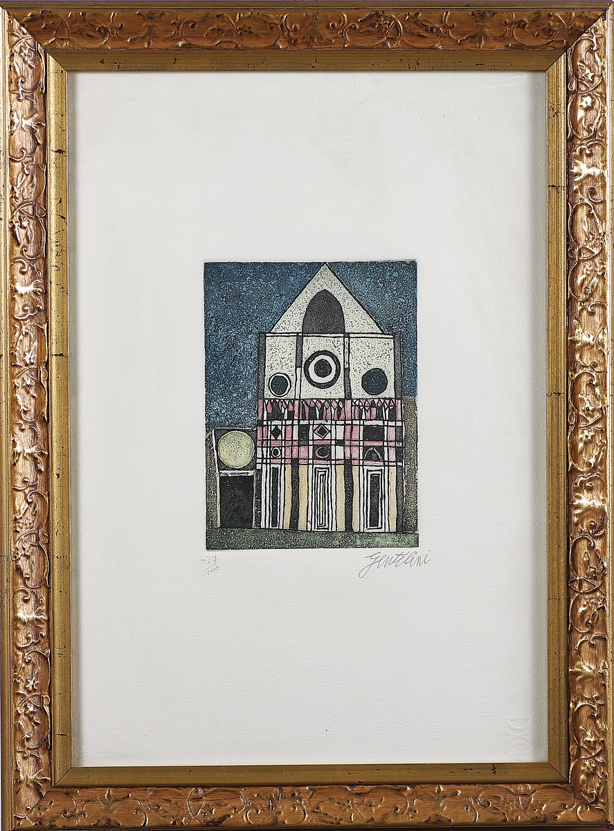 GENTILINI ALDO (1911 - 1982) Senza titolo. Serigrafia. Cm 35,00 x 50,00. Tir. 37/100 e firma in basso a matita. Misure lastra: 20x15cm. Cornice presente