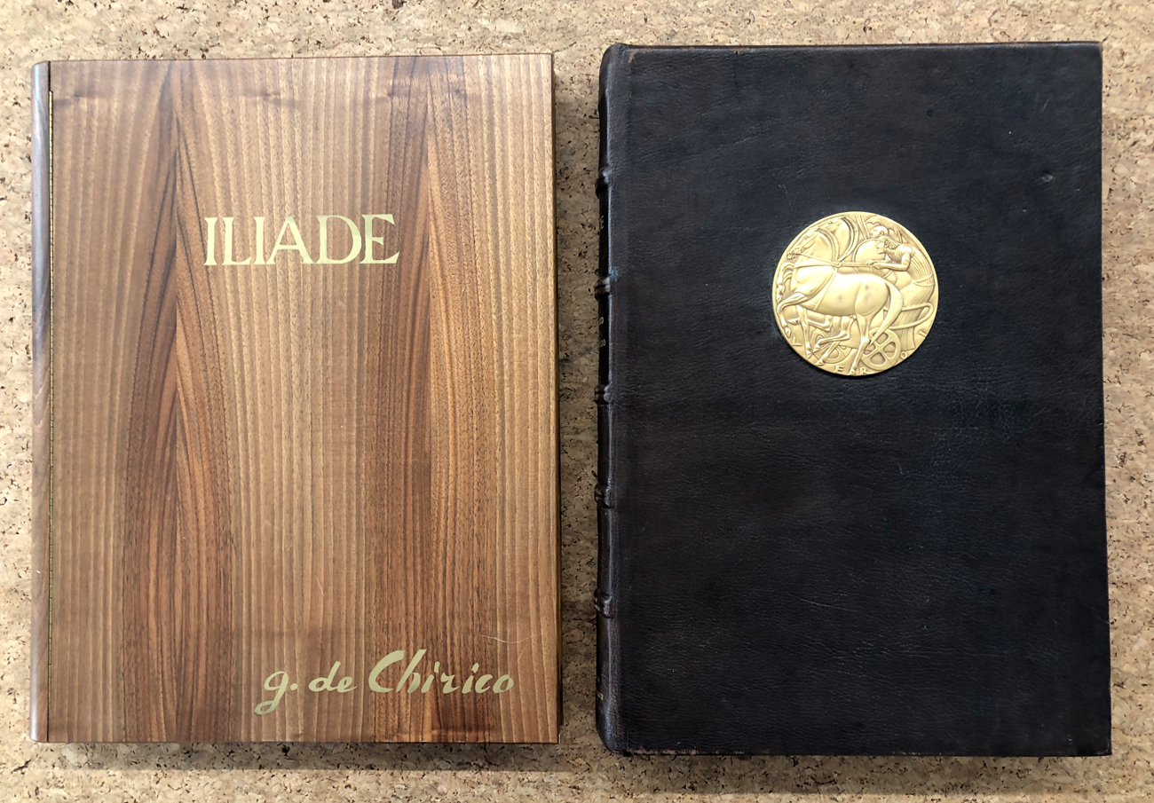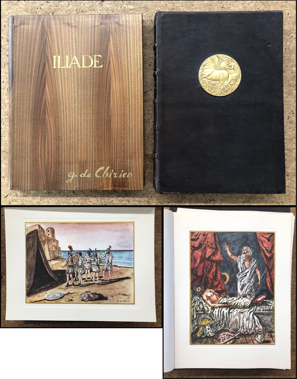 - Un volume accompagnato da una custodia a libro interamente in legno (cm. 40x52x5) contenente le tavole espressamente eseguite da De Chirico per questa tiratura, ognuna protetta da velina.