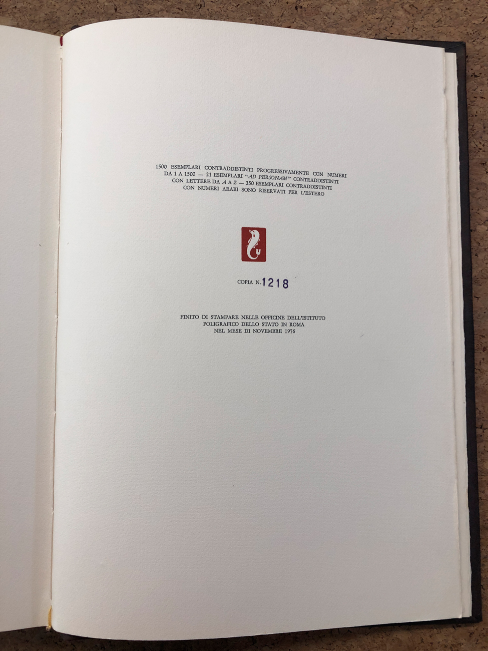 Titolo impresso in oro al dorso a 5 nervi, tre carte bianche, titolo a due colori, occhiello, 147 pp., due bianche, occhiello, colophon con la giustificazione della tiratura, 5 cc. bianche finali