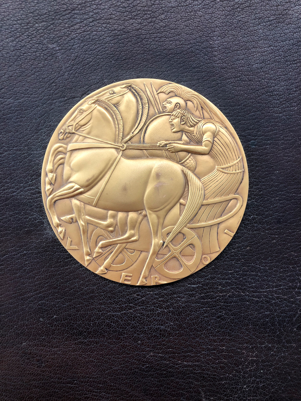 - Un volume in folio imperiale (cm. 34x50) legato in pelle "naturale di capra", recante al piatto anteriore placca rotonda in bronzo di mm. 120 di diametro eseguita da Guido Veroi (riproduzione a bassorilievo di un carro da combattimento trainato da due cavalli, auriga e guerriero con balteo, scudo, elmo e lance)