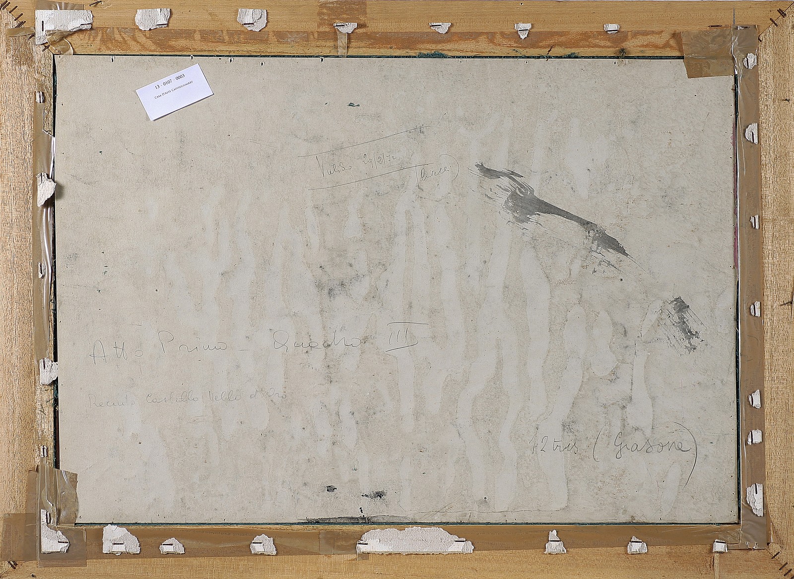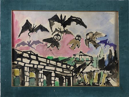 MACCARI MINO (1898 - 1989) Atto primo, quadro terzo. Recinto castello vello d'oro. Tecnica mista su carta. Cm 70,00 x 50,00. Firma in alto a destra.Titolo al retro. Opera archiviata presso l'archivio Mino Maccari , Massa Carrara, come da documentazione fotografica allegata riportante il relativo numero d'inventario. Cornice presente