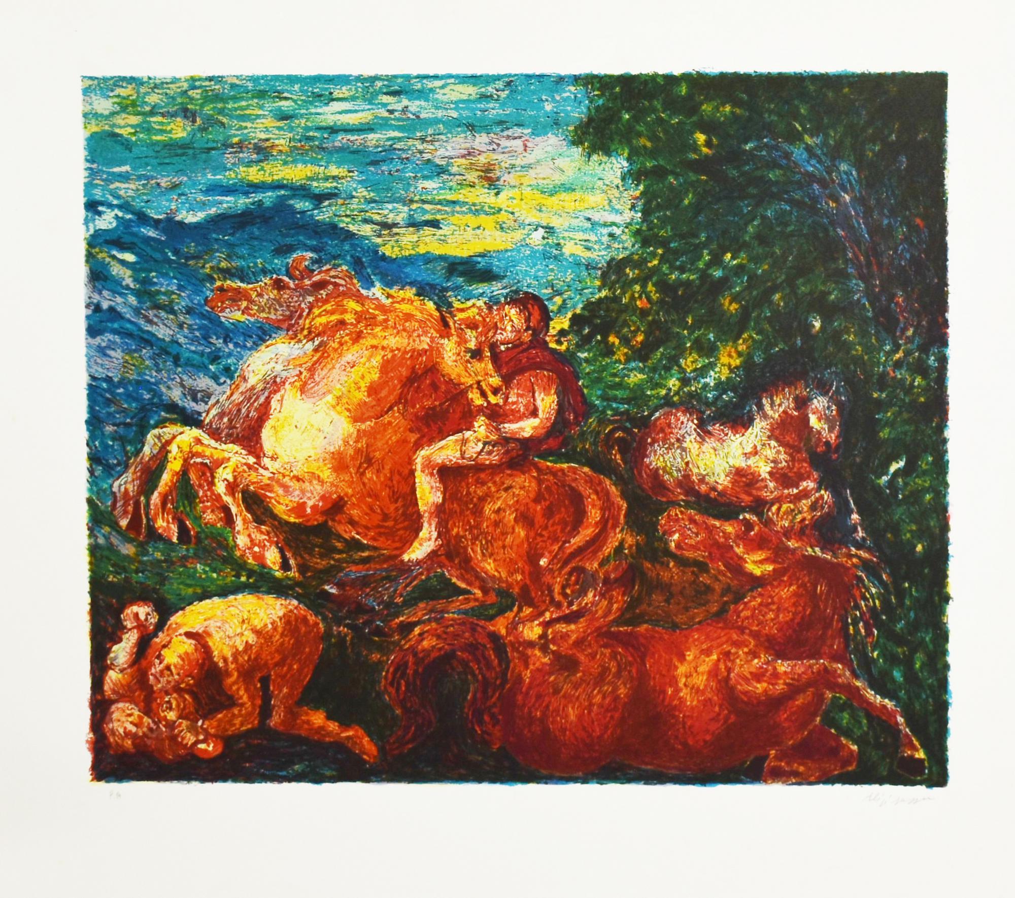 Aligi Sassu CAVALLI litografia su carta, cm 50x60,5, su foglio cm 68x78; P.A....