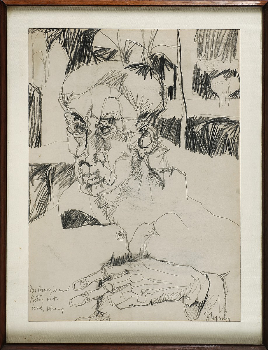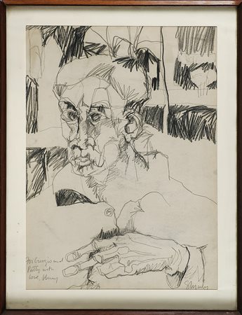 Senza titolo. Matita su carta. Cm 44,00 x 60,00. Dedica e firma in basso a matita. Cornice presente