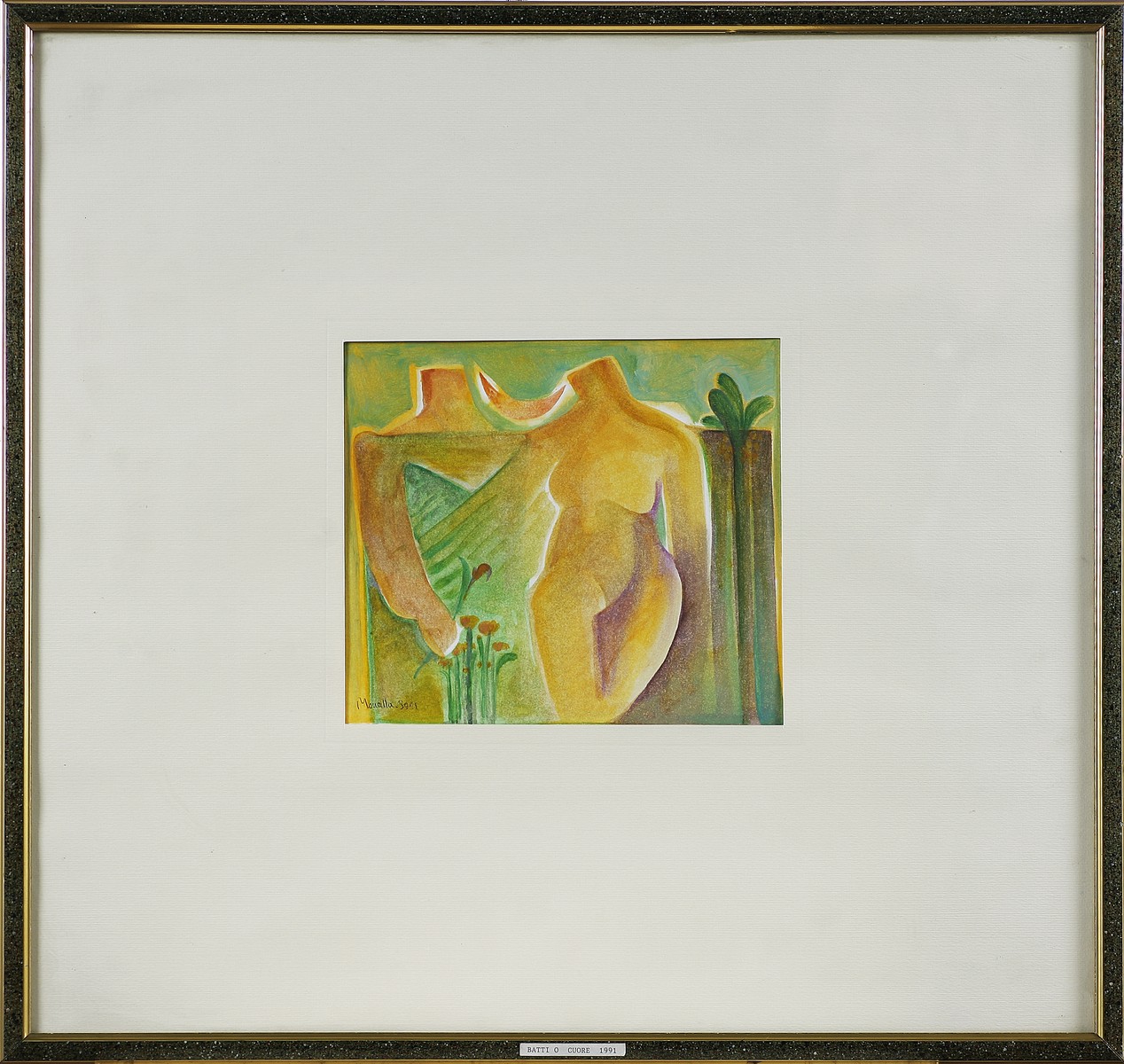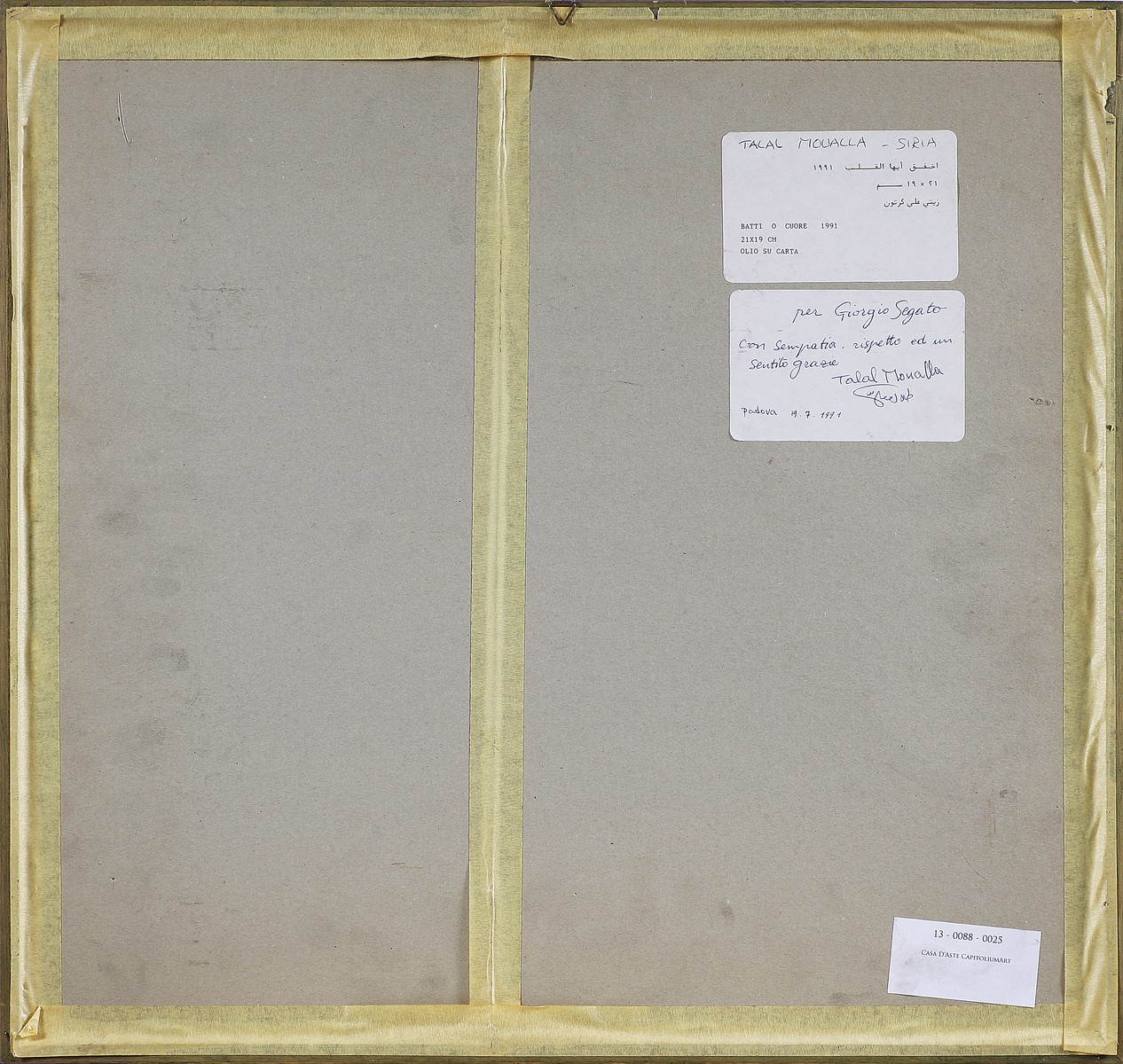 MOUALLA TALAL (n. 1952) Batti o cuore. 1991. Olio su carta. Cm 19,00 x 21,00. Firma e anno in basso a matita. Al retro dedica e firma. Cornice presente
