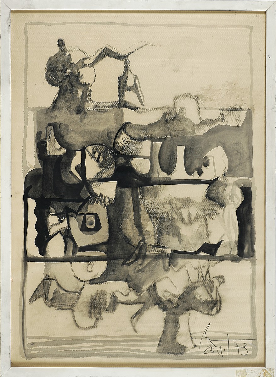 BIGI RINALDO (n. 1942) Senza titolo. 1973. Tecnica mista su carta. Cm 50,00 x 70,00. Firma e anno in basso a destra. Cornice presente