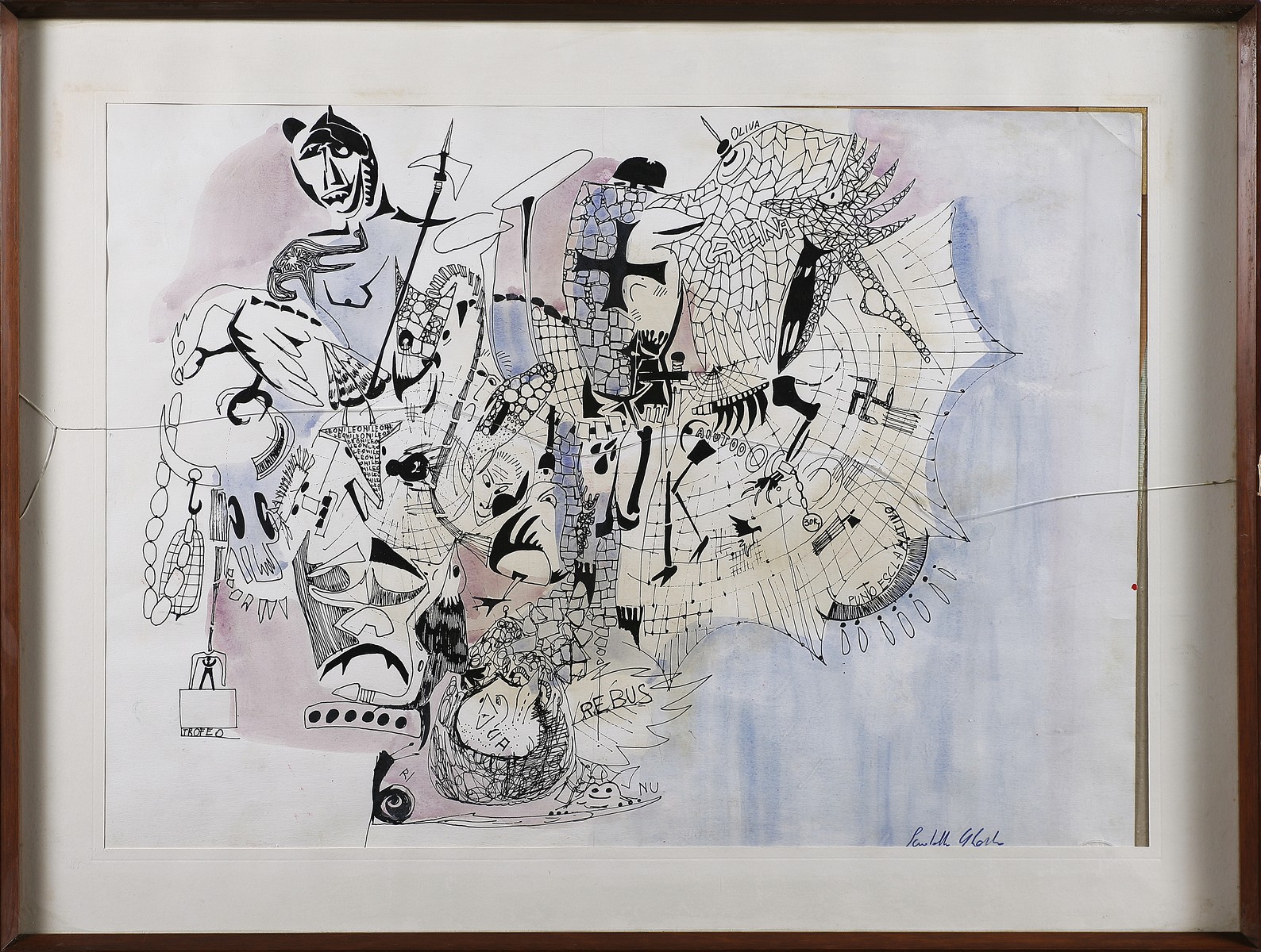 Rebus. Tecnica mista su carta. Cm 68,00 x 49,00. Firma in basso a destra. Cornice presente