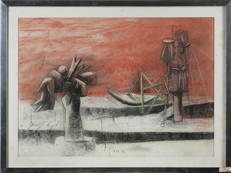 BIGI RINALDO (n. 1942) Senza titolo. 1975. Tecnica mista su carta . Cm 65,00 x 47,00. Firma e anno in basso al centro. Cornice presente