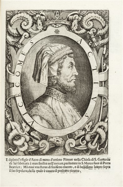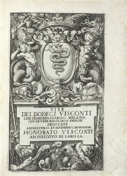 Edizione tradotta da Lodovico Domenichi di questa dettagliata biografia storica illustrata di Paolo Giovio sui Visconti, che contiene anche “gl’Argomenti a ciascuna d’esse vite, con le annotazioni nel margine, & Tavola copiosissima".
