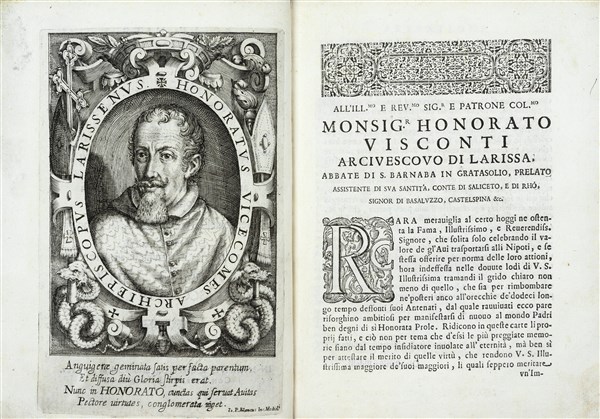 4to (254 x 194mm). Engraved frontispiece with the Visconti coat of arms and engraved portrait of Mons.Honorato Visconti, dedicatee of the work, engraved by Bianchi on the verso of the title, 13 full-page engraved portraits of which the final one repeated twice, initials, woodcut headpieces and tailpieces (occasional light browning). Modern vellum, manuscript title on spine and ties; preserved in a modern decorated paper case.