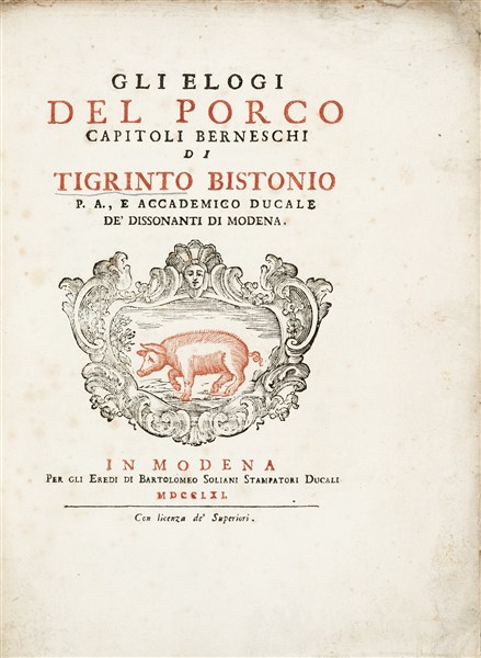 Prima edizione di questo curioso trattato che esalta il maiale e i prodotti che ne derivano '..ad ogni figura accomodar ti fai/ arrosto, fricando', lesso, bragiole / e sempre piaci e non disgusti maia..'. L'Autore attribuisce alla sua città, Modena, la primogenitura nella produzione del cotechino: "Oh cotichin / null'altra a te somiglia / in fragranza, e in sapor vivanda eletta!".
