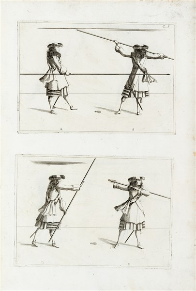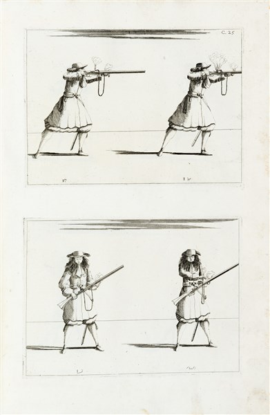 Buona copia dagli ampi margini e con forte impressione delle tavole della prima edizione di uno dei più bei trattati militari italiani del XVII secolo. Le magnifiche tavole illustrano tutti gli usi della picca e del moschetto, le formazioni di battaglia, la marcia, etc. Il dedicatario era noto all'epoca per aver fondato un piccolo, ma permanente, esercito bavarese.