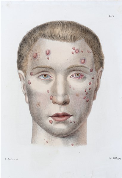 Prima traduzione italiana di quest'opera del celebre medico francese che per primo distinse e descrisse esattamente i tre stadi della sifilide differenziando l'ulcera sifilitica dall'ulcera molle. Con dettagliate tavole a colori con alcuni ritocchi fatti a mano.