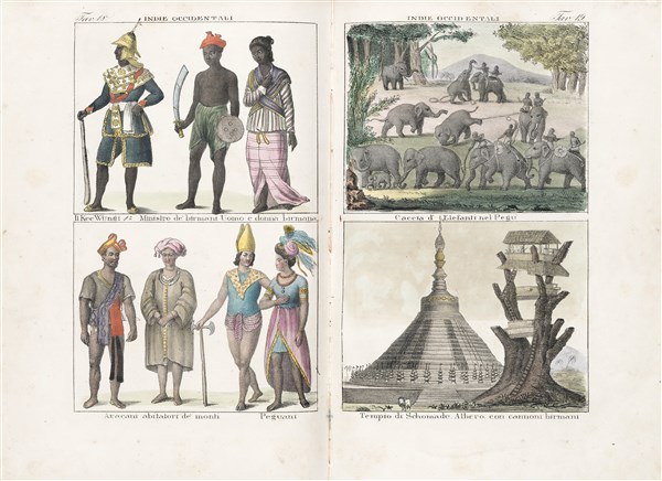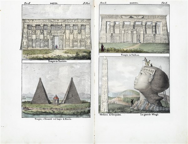 Copia corredata dalle tavole colorate a mano all'epoca che illustrano gli usi e costumi dei vari paesi del mondo. Il primo volume è dedicato all'Asia, il secondo all'Africa, il terzo alle Americhe e l'ultimo all'Europa.