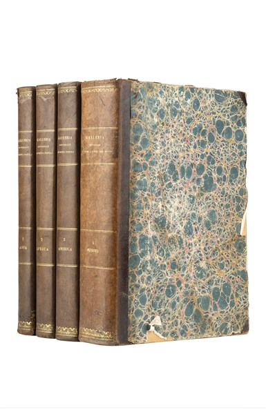 A copy with the plates handcoloured at the time. The first volume is dedicated to Asia, the second to Africa, the third to the Americas and the final to Europe.