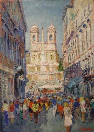 Emilio Comba (Torino, 1924). Trinità dei monti da via dei Condotti. Olio su...