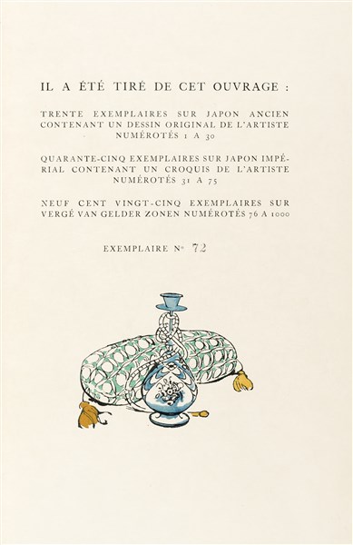 Copia di pregio con acquerello originale in legatura firmata F. Bousquet. N. 72 di 45 esemplari su Japon da un'edizione di 975 copie.