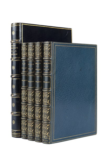 THACKERAY, William Makepeace [detto TITMARSH] - Lotto di 4 opere dell'autore: Rebecca and Rowena (Londra: 1850), Our Street (1848), Doctor Birch (1849), Kicklebury on the Rhine (1850) in legature uniformi in marocchino blu decorato in oro, con sguardie in seta rossa, tagli dorati e firmato L. Broda. -