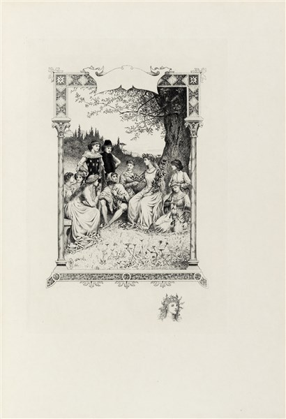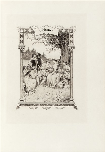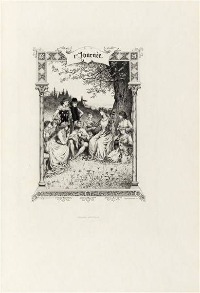 Pregiato set in perfette condizioni di questa ricercata edizione del XIX secolo del Decamerone: esemplare ad personam per lo stampatore Gustave Boudet, uno dei 25 su Japon contenente - oltre alle 30 acqueforti in tre stati - un acquerello originale firmato di Wagrez e una suite a parte di tutte le en-tête e i culs-de-lampes tirati in bistro.