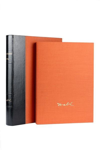 Folio(454 x 325mm). Frontespizio in rosso e nero, 21 puntesecche a colori, 6 firmate e 15 siglate a matita in calce da Dalì, protette da velina. Cartella editoriale in tela rossa, con riproduzione della firma di Dalì impressa in argento al piatto anteriore, contenuto entro custodia in mezza pelle, con titoli in oro al dorso e tagli marmorizzati (minime tracce di polvere alla custodia e piccolo difetto alla giuntura).