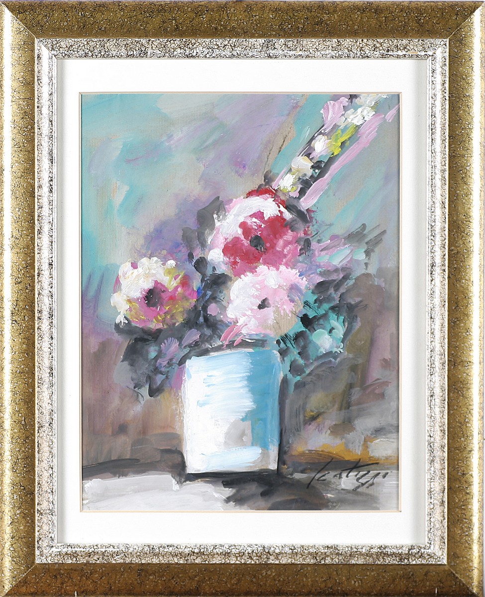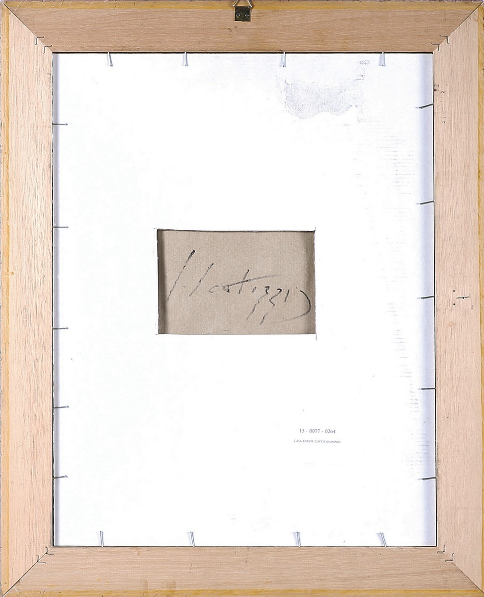SCATIZZI SERGIO (1918 - 2009) Senza titolo. Olio su carta. Cm 30,00 x 40,00. Firma in basso a destra. Firma al retro. Autentica dell'artista su fotografia. Cornice presente