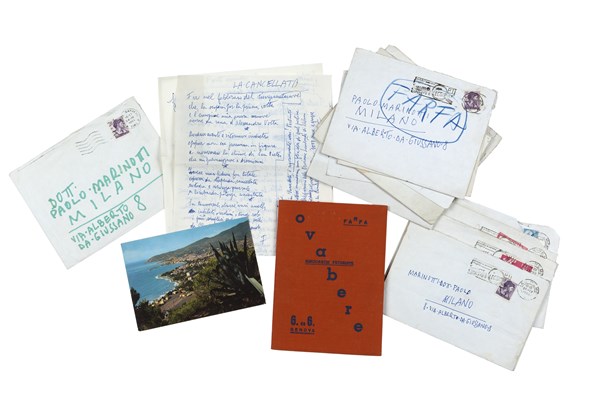 An interesting group of letters and compositions sent between June 1962 and April 1964 to Paolo Marinotti a few months before his death; important collector, general secretary of the International Center of Arts and Costume in Venice and curator of a series of international art exhibitions at Palazzo Grassi. The subject of the correspondence is a possible collaboration between the two (which will end with the publication of "Ansianismo") which is introduced by Farfa in the first letter, dated June 20, 1962, stating that he sent the copy of "Ovabere" to submit to Marinotti his work which had already been published and, at the same time, to express the desire to publish 12 "ultra-abstract" lyrics still unpublished. In subsequent letters Tommasini, in communicating with the curator, werite with all his rich prosaic and poetic repertoire with a futurist echo that makes this short of correspondence a fine example n of the poet's style. In the final letter, stamped on April 24, 1964, Farfa poetically thanks Marinotti for having edited and printed "Anxiety: Farfa's texts and engravings. Introd. By Paolo Marinotti" published in March of the same year, the last work of the poet who died in a car accident in August.
