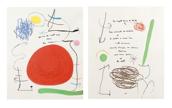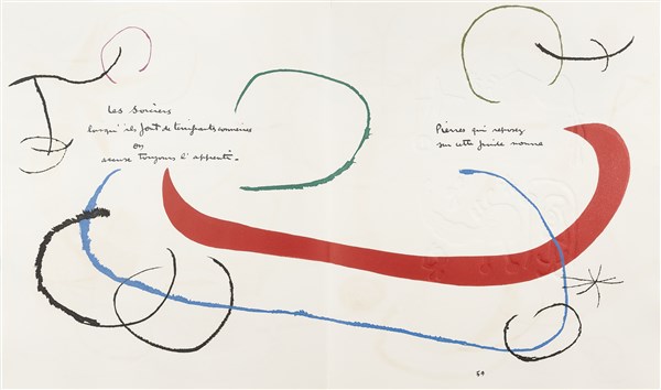 Presentation copy from the editor to Henri Giaume, Marguerite Maeght's cousin and vice-president of the Louis-Dreyfus bank in New York, n. 53 in perfect conditions of 200 (from a total edition of 225) on papier d'Arches paper sometimes decorated in blind. Complete with all etchings and aquatints including the double-page which is signed and numbered by Mirò. Signed at the colophon in pencil by the artist and in red pencil by the publisher, while Prevert's signature is printed.