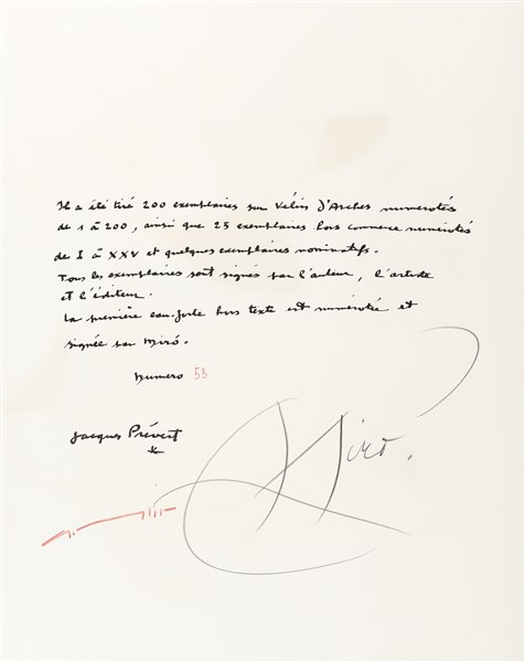 Copia di presentazione da parte dell'editore a Henri Giaume, cugino di Marguerite Maeght e vice-presidente della banca Louis-Dreyfus a New York, n. 53 in perfetto stato di conservazione di uno dei 200 esemplari (da un'edizione di 225) su carta velina d'Arches talvolta decorata a secco. Completo di tutte le acqueforti e acquetinte inclusa quella iniziale a doppia pagina firmata e numerata da Mirò. Come ogni copia l'esemplare è anche firmato al colophon a matita dall'artista e a matita rossa dall'editore mentre la firma di Prevert è stata stampata.