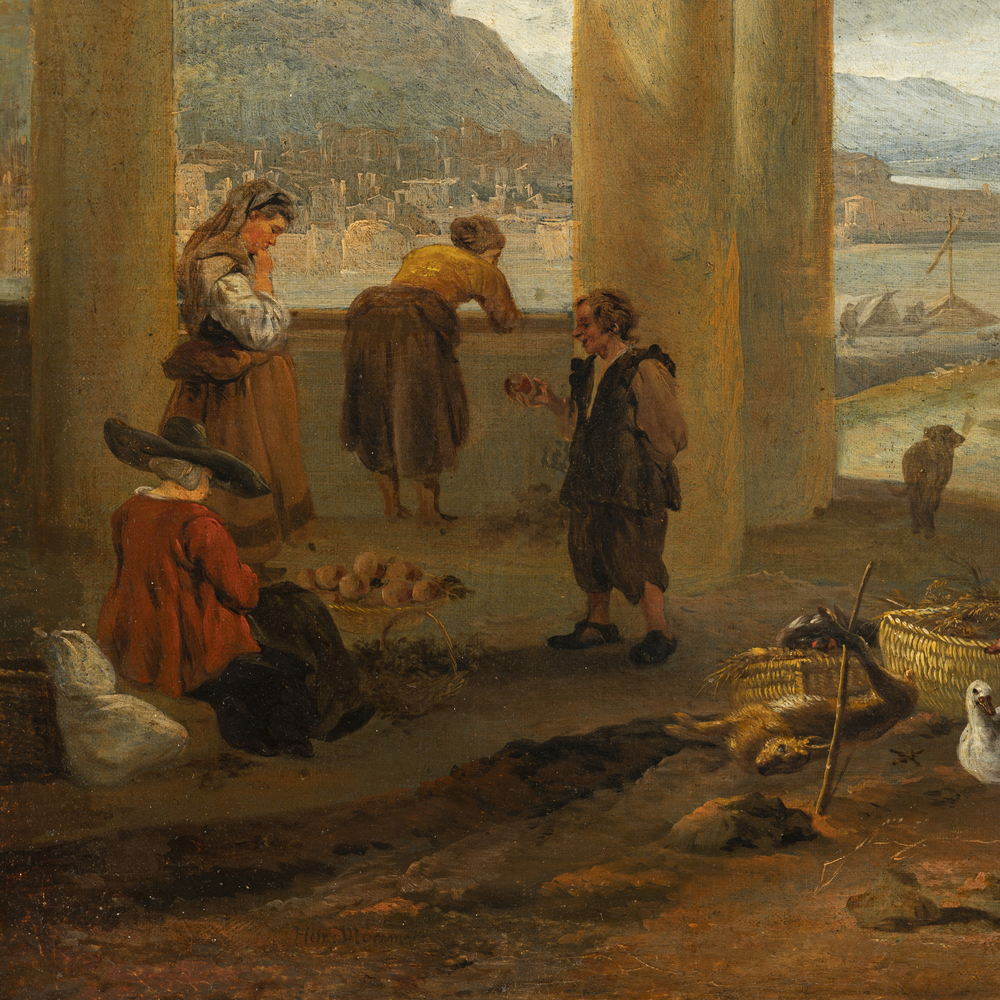 Hendrik Mommers è stato un allievo di Nicolaes Berchem, pittore specializzato in scene pastorali. I due artisti giunsero insieme a Roma, dove si fermarono fra 1644 e il 1646, estasiati dalla bellezza dell’Urbe e della campagna laziale. A Roma, Mommers dipinge scene pastorali con animali e scene di mercato con mazzi di ortaggi, usando come sfondo le piazze romane o paesaggi con antiche rovine. Il soggiorno romano continua a nutrire la sua fantasia anche dopo il ritorno in patria, quando si specializza nel genere italianizzante, seguendo le orme di Johannes Lingelbach ad Amsterdam e Anton Goubau ad Anversa. Dipinse anche paesaggi olandesi, con figure di pastori e con bestiame al pascolo, sotto fondali di cieli immensi e solcati da nuvole, utilizzando una tavolozza di tinte calde e bionde che ricorda quella dei paesaggi, con scene di genere, dipinti da Aelbert Jacobsz Cuyp