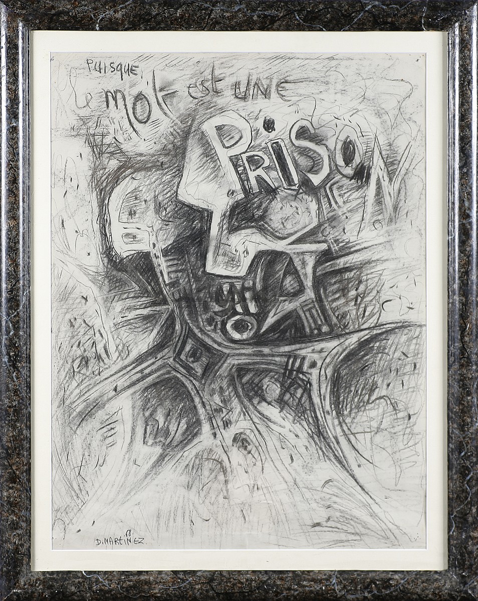 MARTINEZ DENIS (n. 1941) Puisque le mot est une prison. 1968. Tecnica mista su carta. Cm 48,00 x 65,00. Firma e anno in basso a sinistra. Al retro reca il cartiglio della mostra personale di grafica tenuta presso Palazzo Strozzi, Firenze nel 1970. Cornice presente