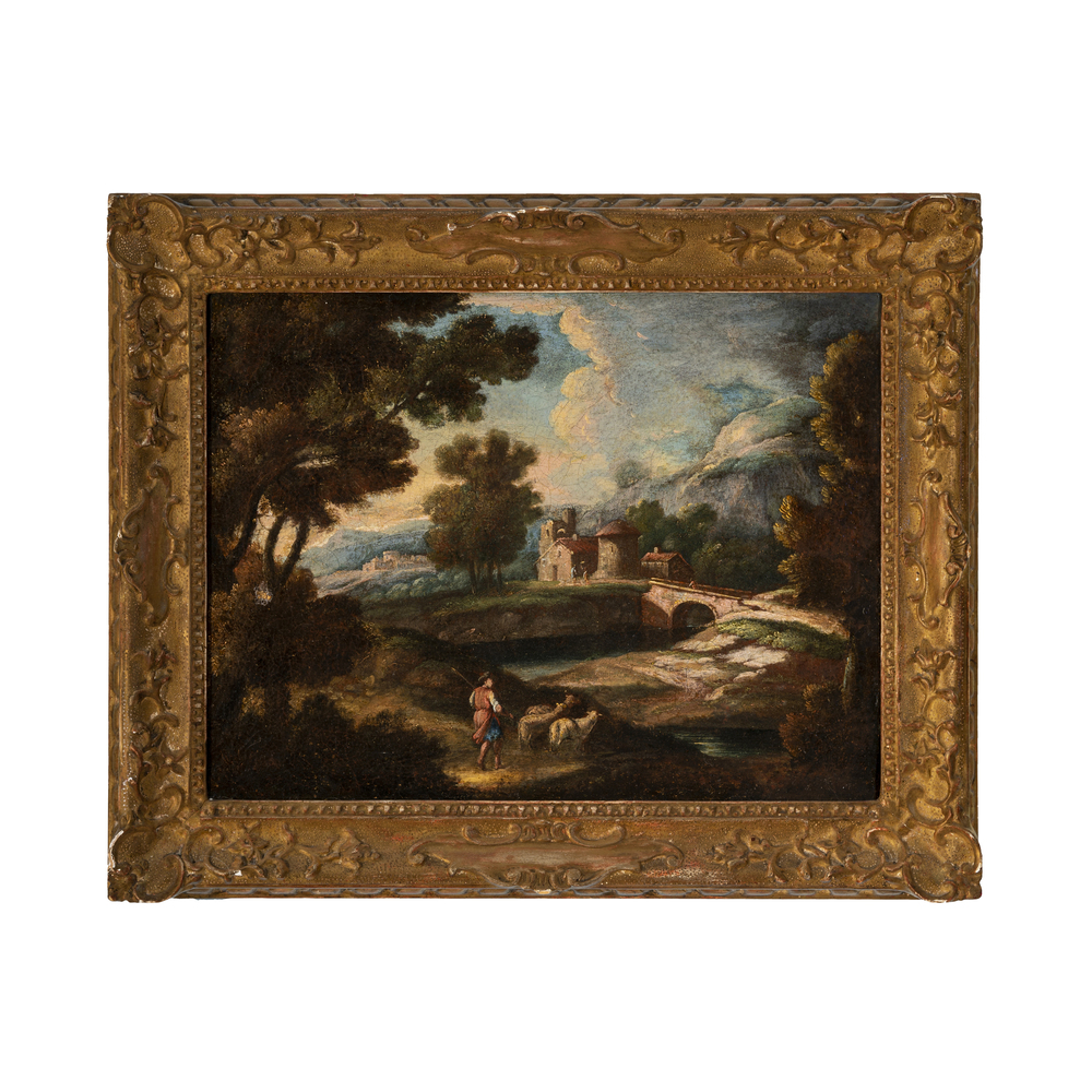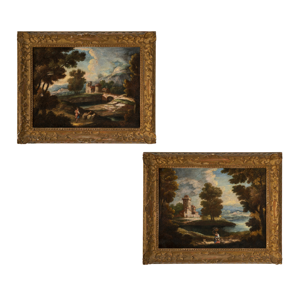 La bella coppia di opere è la testimonianza dell’ampia produzione paesaggistica avvenuta in Veneto per mano di una nutrita schiera di pittori, ad oggi ancora anonimi o poco conosciuti, al seguito del successo di Pieter Mulier detto Cavalier Tempesta, Antonio Maria Marini, Marco Ricci, Antonio Stom, Bartolomeo Pedon, Giuseppe Zais, Antonio Diziani e Francesco Zuccarelli: tutti artisti che invece hanno segnato l’epoca e sono studiati ed apprezzati tutt’oggi. Tra i pittori esclusivamente paesisti, cosiddetti minori, possiamo citare: Pietro Brancaleone, Francesco Antonio Canal, l’engmatico Maestro delle Montagne Azzurre, Domenico Pecchio, Tomaso e Andrea Porta, Giuseppe Roncelli, Gaetano Zais e il ferrarese Giuseppe Zola per affinità stilistica. A questa già cospicua schiera vanno aggiunti moltissimi altri artisti che producevano paesaggi non costantemente, e un gran numero di artisti rimasti nell’anonimato: tra questi, l’autore delle nostre due tele, che mostrano un carattere arcadico desunto da Marco ricci nella rivisitazione fatta dallo Zais della prima maniera. Infine, la pastorella con la cesta in testa, pratica poco comune in Veneto, è stata desunta da qualche opera di Pieter Mulier, visto che coincide perfettamente con una delle due figure femminili in “Figure di lavandaie presso un ponte” dei Musei Civici di Arte e Storia, Pinacoteca Tosio Martinengo, di Brescia. Questi elementi permettono di porre l’interessante coppia nel panorama del paesaggismo veneto del secondo quarto del XVIII secolo