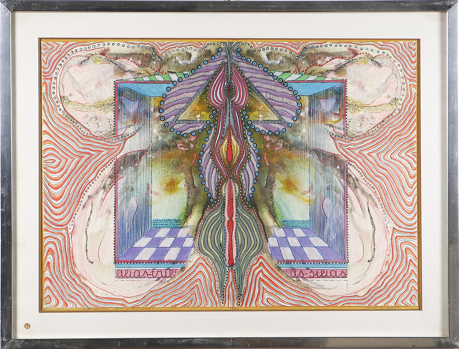 MEMO NINO (n. 1941) Mistico. 1974. Tecnica mista su carta. Cm 70,00 x 50,00. Firma anno e titolo in basso al centro. Cornice presente