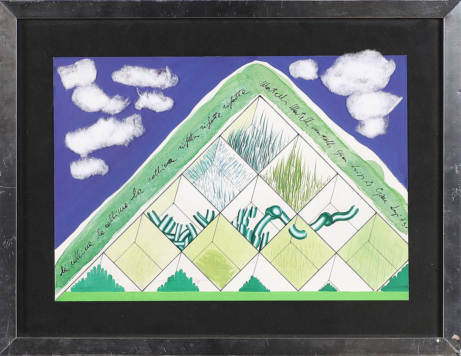 MARTELLI GIANLUIGI (n. 1949) La collina rifatta. 1973. Tecnica mista su carta. Cm 32,00 x 22,00. Titolo firma e data al centro. Cornice presente