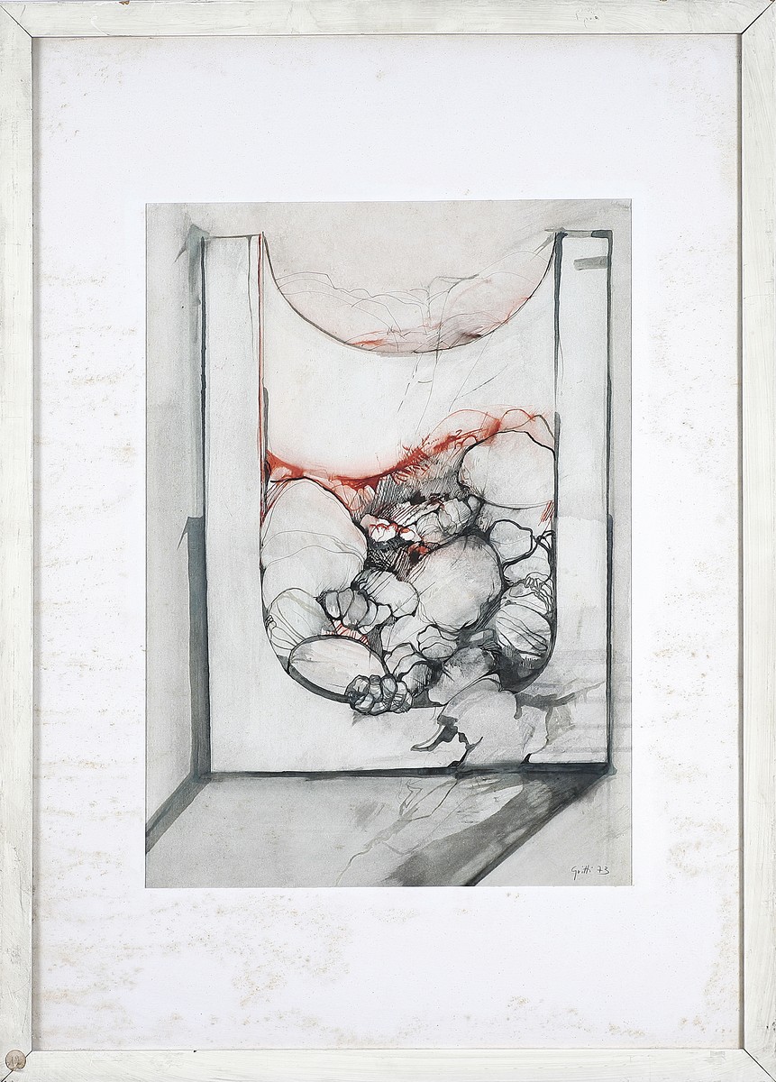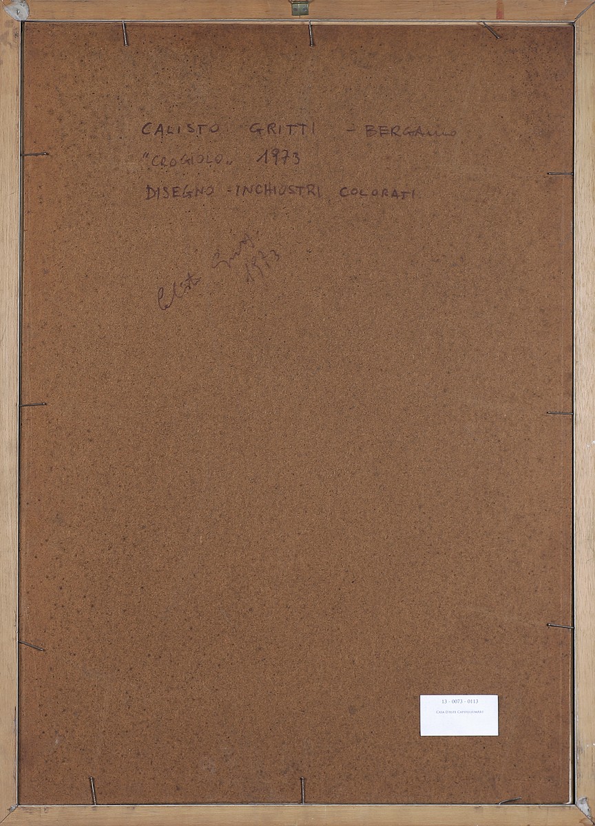 GRITTI CALLISTO (n. 1937) Crogiolo. 1973. Inchiostri su carta. Cm 34,00 x 47,00. Firma e data in basso a destra. Al retro firma titolo e anno. Cornice presente