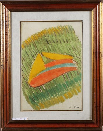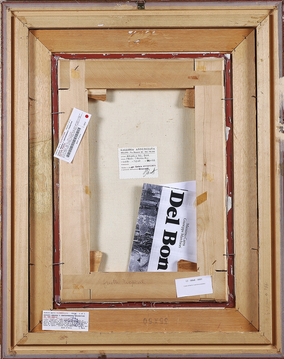 DEL BON ANGELO (1898 - 1952) Frutti tropicali. 1948. Tecnica mista su carta su tela. Cm 48,00 x 33,00. Firma in basso a destra. Al retro cartiglio della Galleria Dell'Annunciata, Milano. Opera pubblicata sul volume De Bon, a cura di Massimo Carrà e Giuseppe Marchiori, Giulio Bolaffi editore, pag. 713, tav. 48/44. Cornice presente