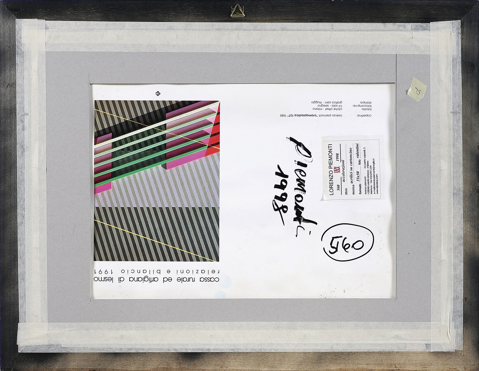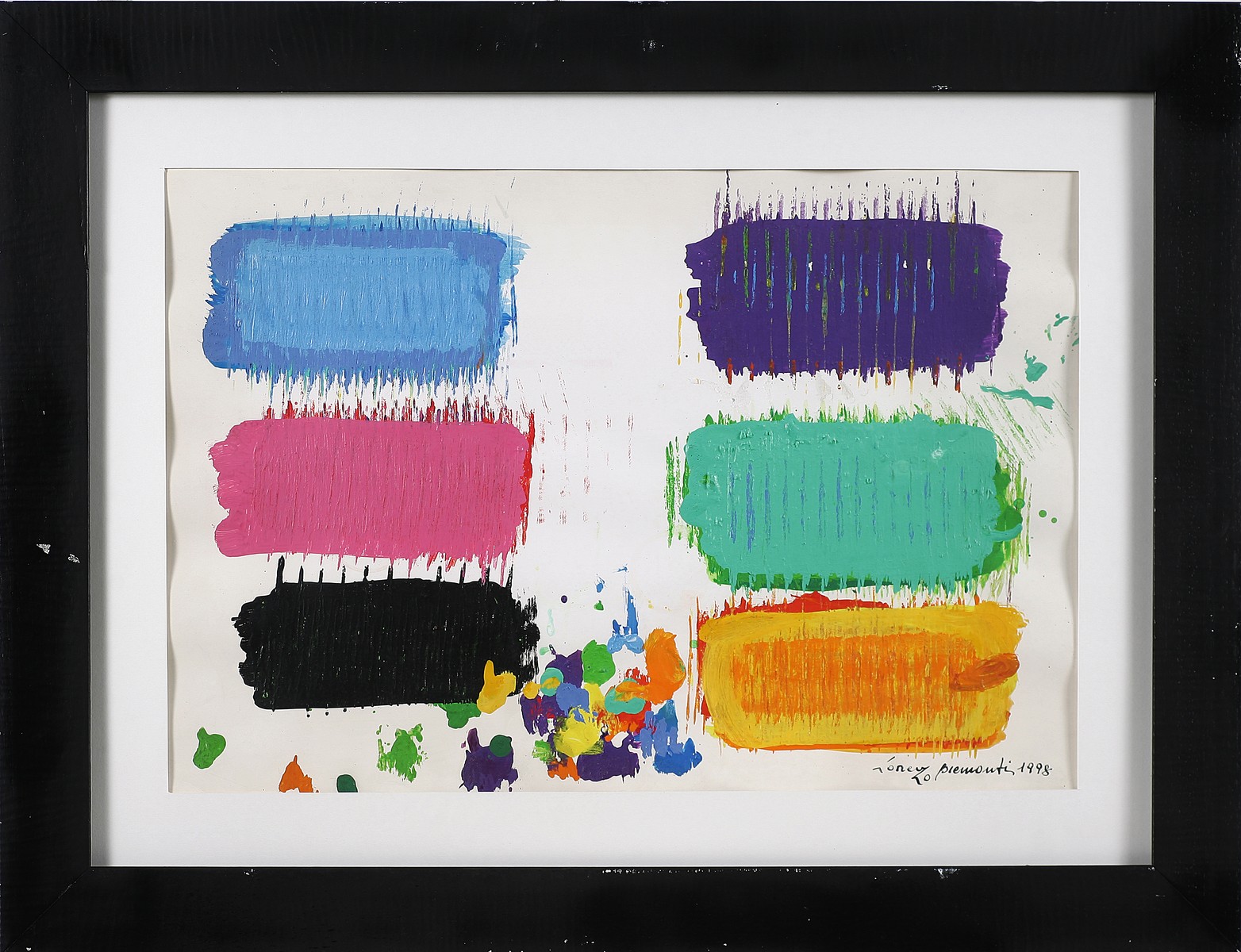 PIEMONTI LORENZO (n. 1935) Senza titolo. 1998. Acrilico su cartone. Cm 35,00 x 50,00. Firma e data in basso a destra. Opera archiviata presso l'Archivio Lorenzo Piemonti come da documentazione fotografica allegata riportante il numero d'archivio. Al retro data, firma e cartiglio descrittivo dell'opera. Cornice presente