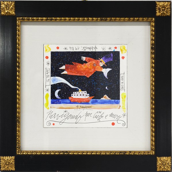 Francesco Musante "Navigando per cieli e mari" 1984 tecnica mista su tavola cm 2