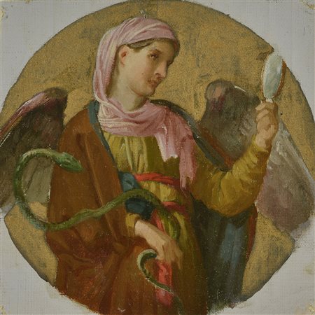 Gaetano Marinelli (1838-1924) Allegoria della Prudenza Olio su tela, cm. 15,5x16 Bozzetto per gli affreschi della cupola di una delle cappelle del Santuario della Madonna Del Monte a Genova, 1905-1906 ca.